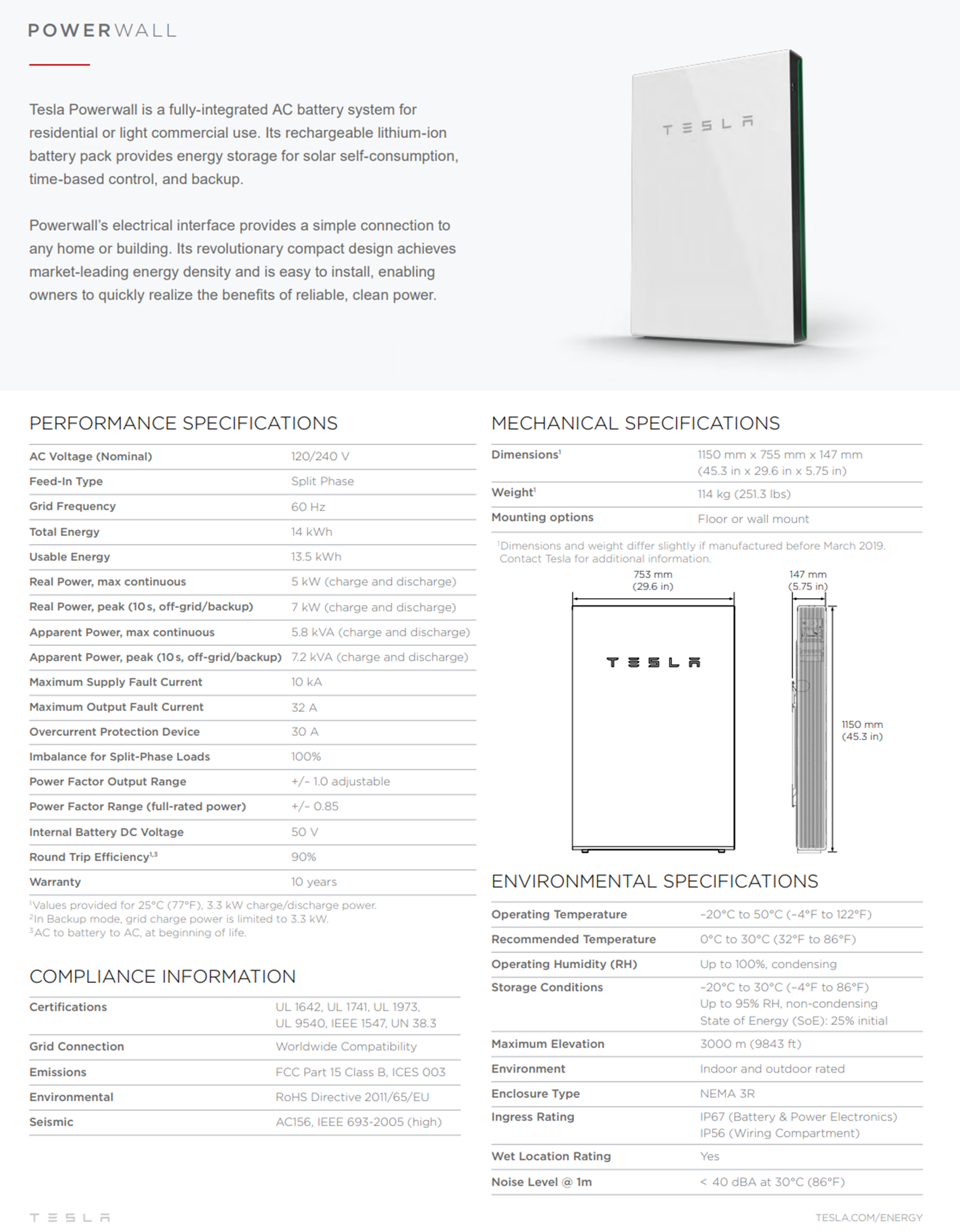 The Powerwall 2 comes with a 10 year, unlimited cycle warranty and a 4-year workmanship warranty covering any repairs, replacement parts, shipping, and installation related issues. Tesla guarantees the Powerwall 2 will have 70% of its original 13.5 kWh capacity, at the end of the tenth year. Tesla offers what may be the strongest battery warranty available in 2023.